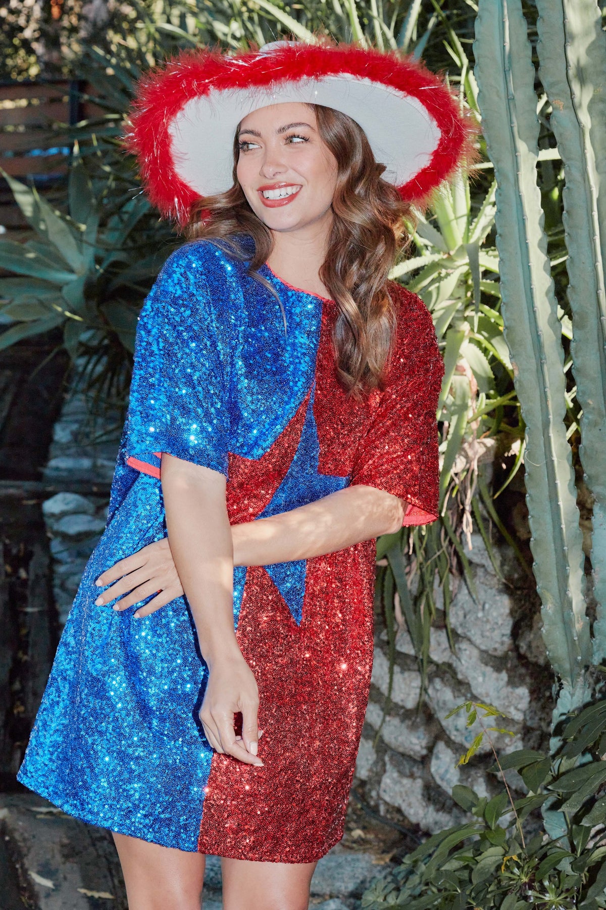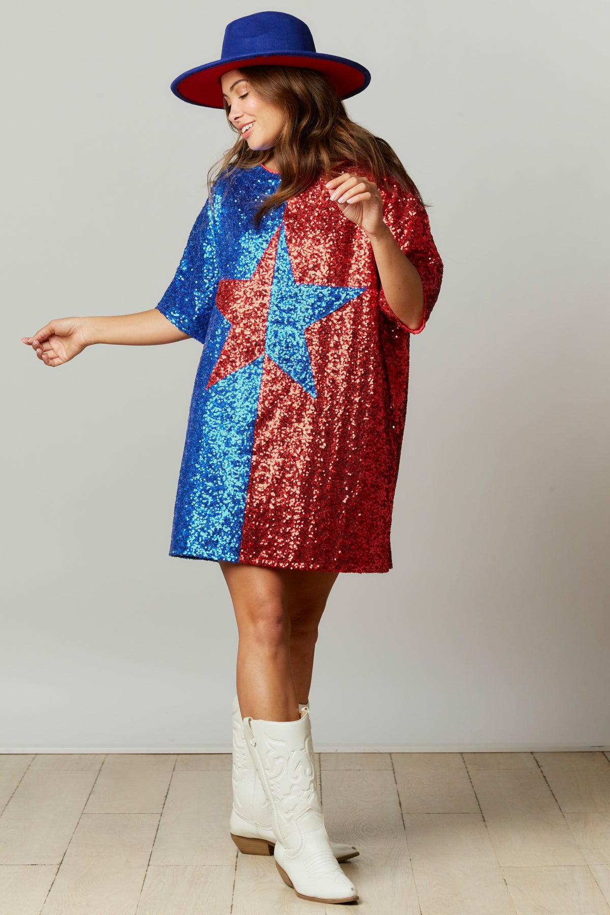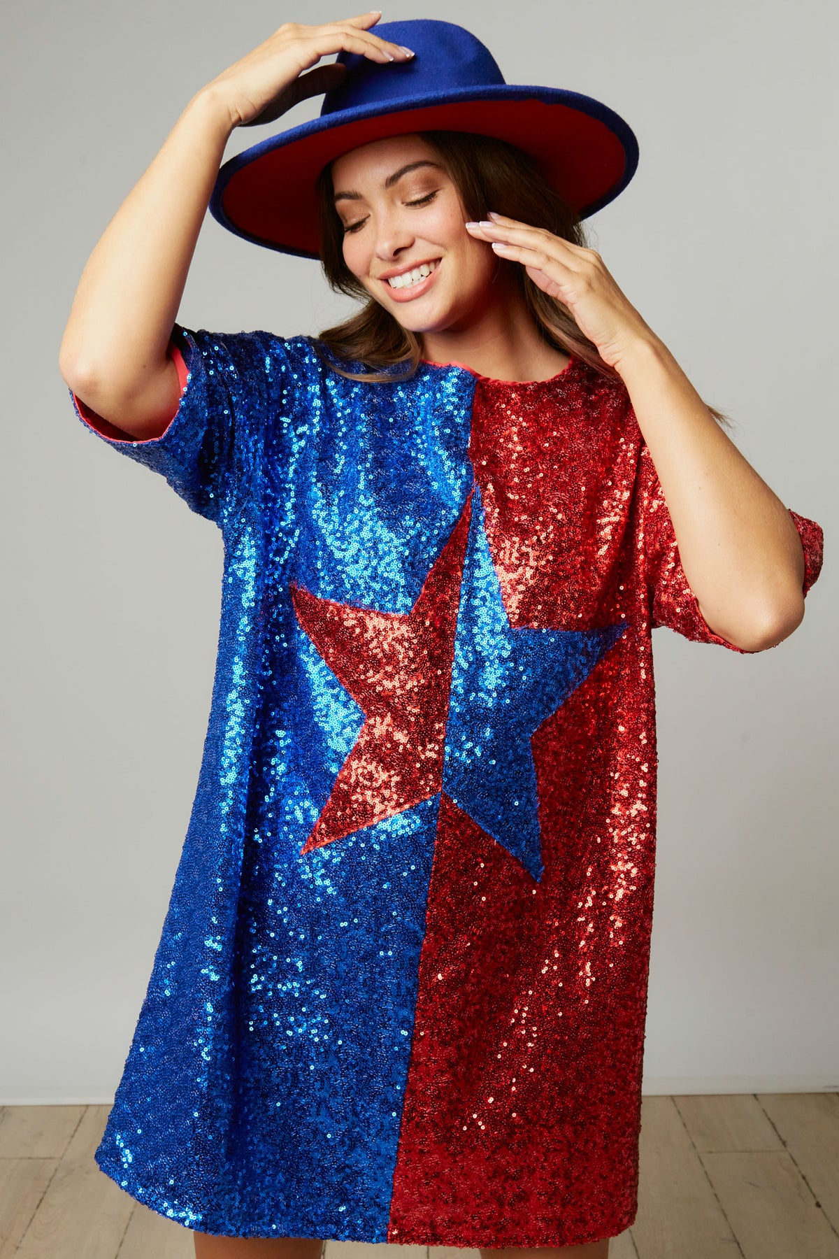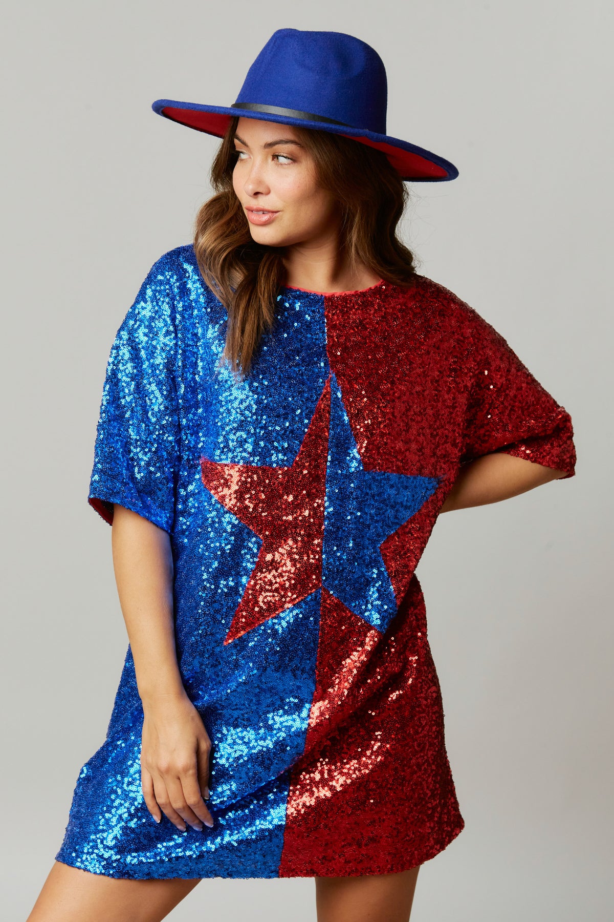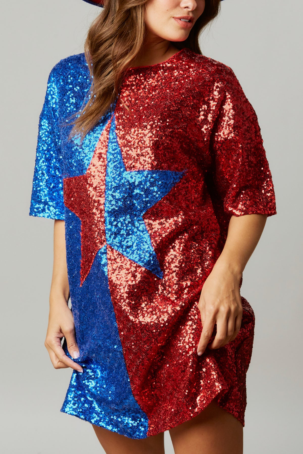 Dazzle and shine bright like a diamond in this star print dress! This dress is perfect for all the holidays and festivities coming up. Wear it for 4th of July, concerts, festivals, b-day celebrations, parties, and more! The roomy fit makes this dress easy to wear and the dress is lined so you can't feel the sequins!Â