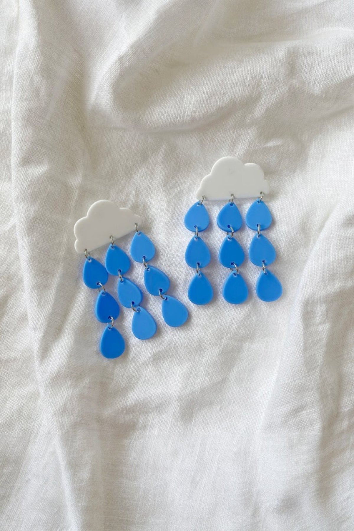 A lightweight acrylic resin earring composed of a rain cloud and streams of water droplets in block colors. Fastened to the lobe with nickel free steel earring posts, approximately 70mm in length and 34mm in width.