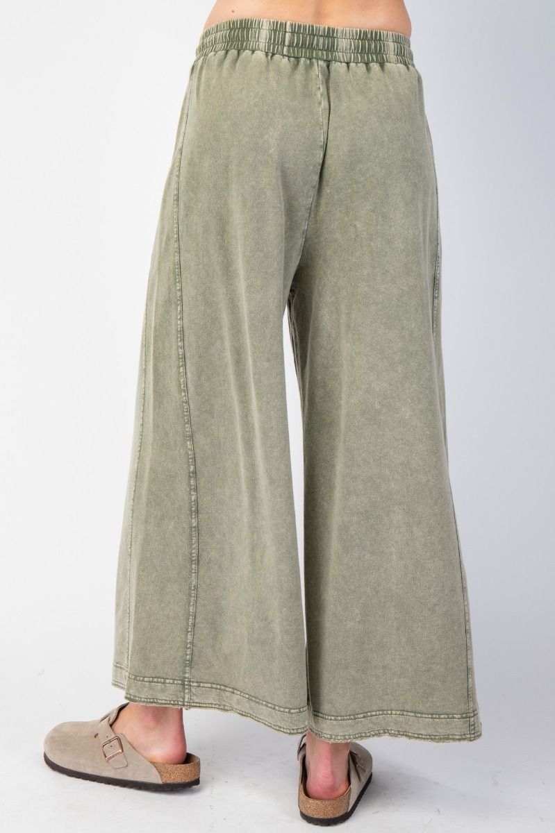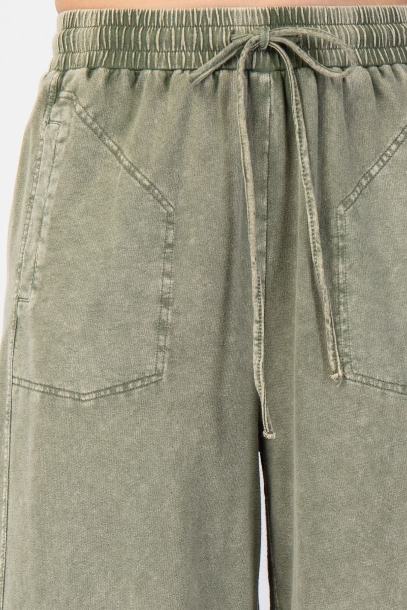 Experience stylish comfort with our Cozy On The Go Mineral Washed Terry Knit Pants in Faded Olive! The wide leg fit and elastic smocked waistband provide a loose and relaxed fit. Front pockets, defined seams, and double side seam detailing add functional and fashionable touches. Perfect for any adventure or just a lazy day on the couch.Â
