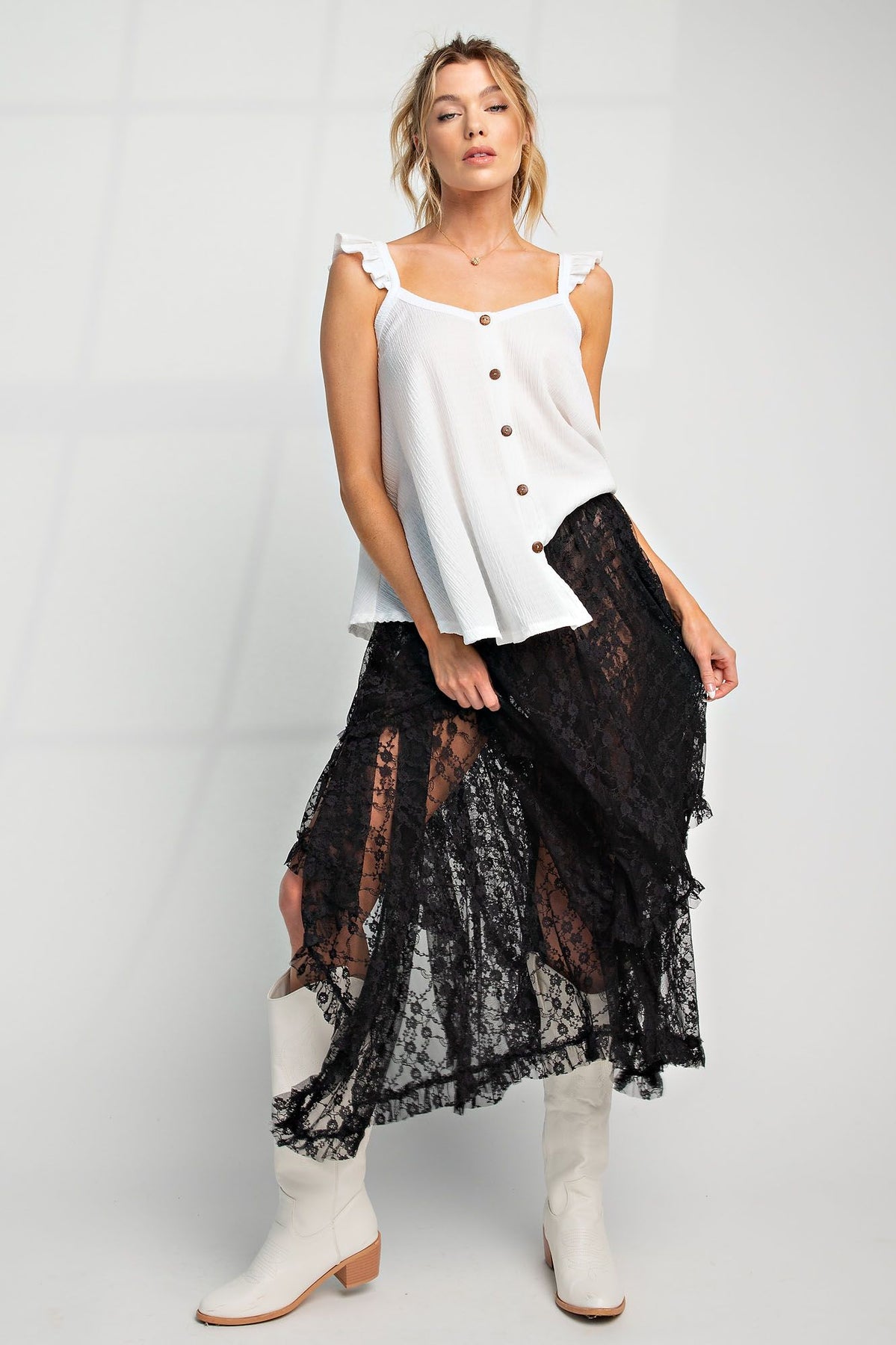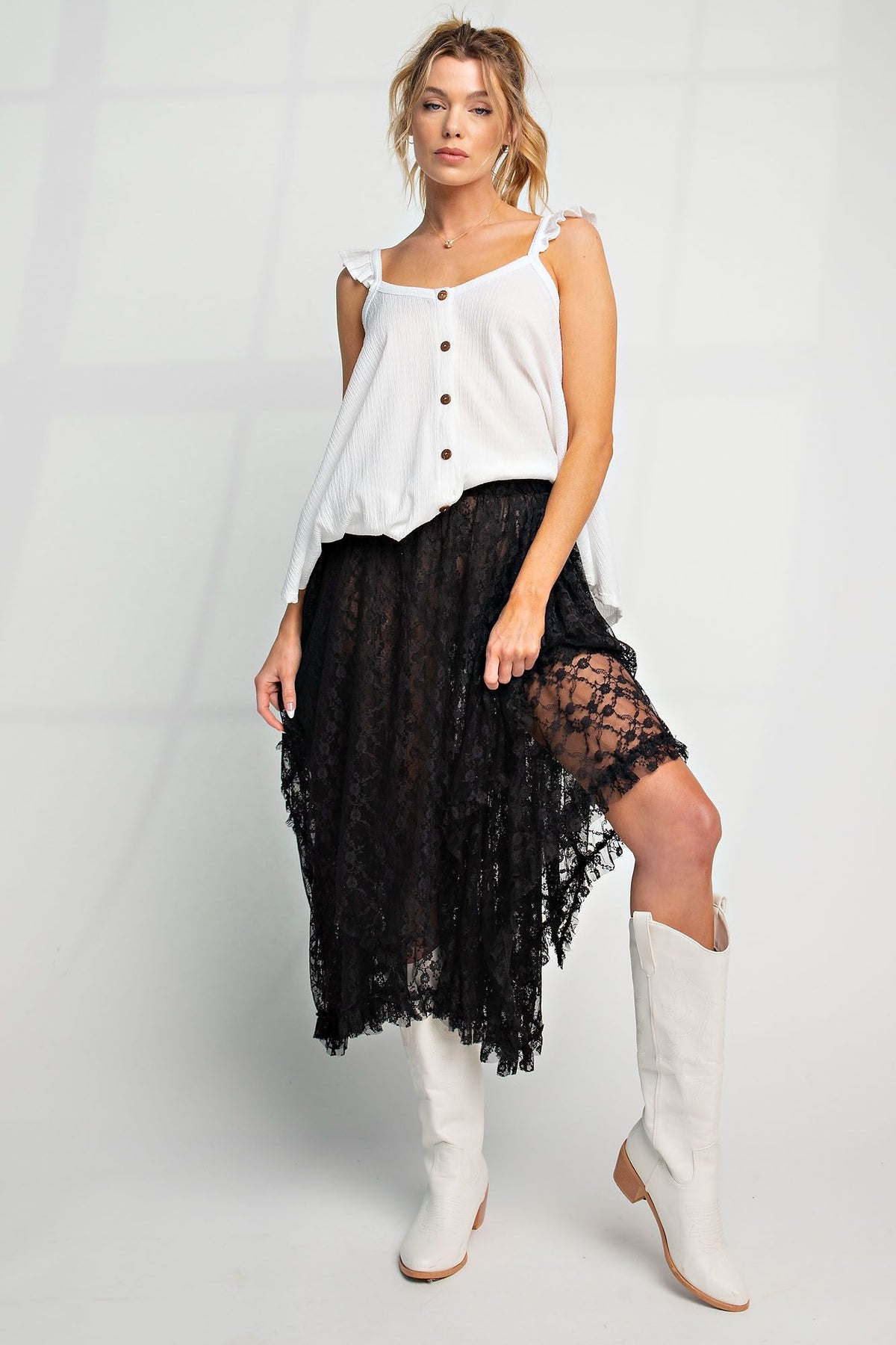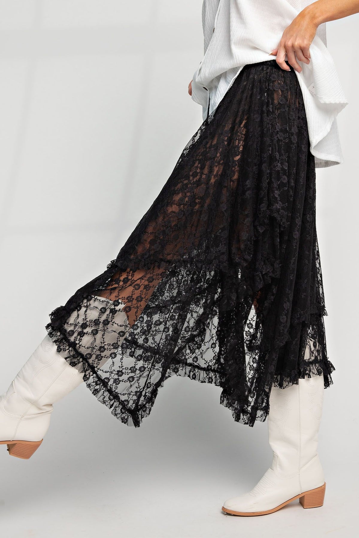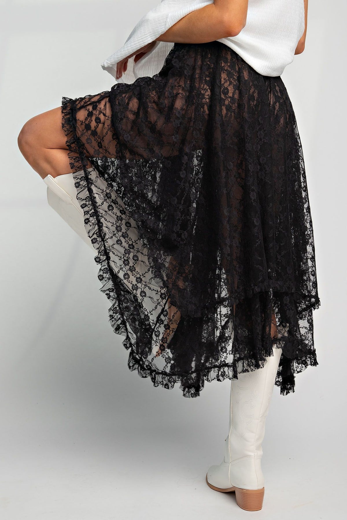 It's giving edgy boho cowgirl and we are here for it! This sheer lace skirt goes perfectly with all your Western boots and adds a feminine flair to your look! We love this paired with black shortie shorts for more coverage!Â