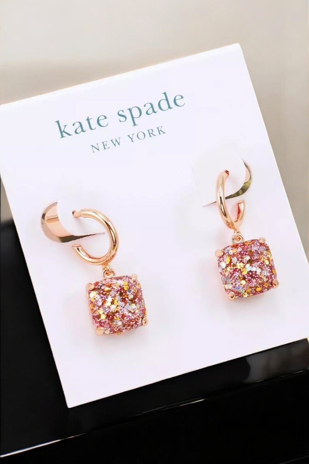 Add a touch of sparkle with these Kate Spade New York Mini Small Square Drop Earrings in Rose Gold Glitter. The perfect accessory for any occasion, these earrings will instantly elevate your outfit with their playful charm. Just the right amount of glitz and glam!