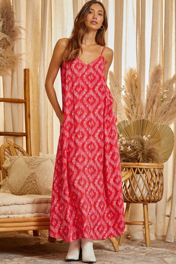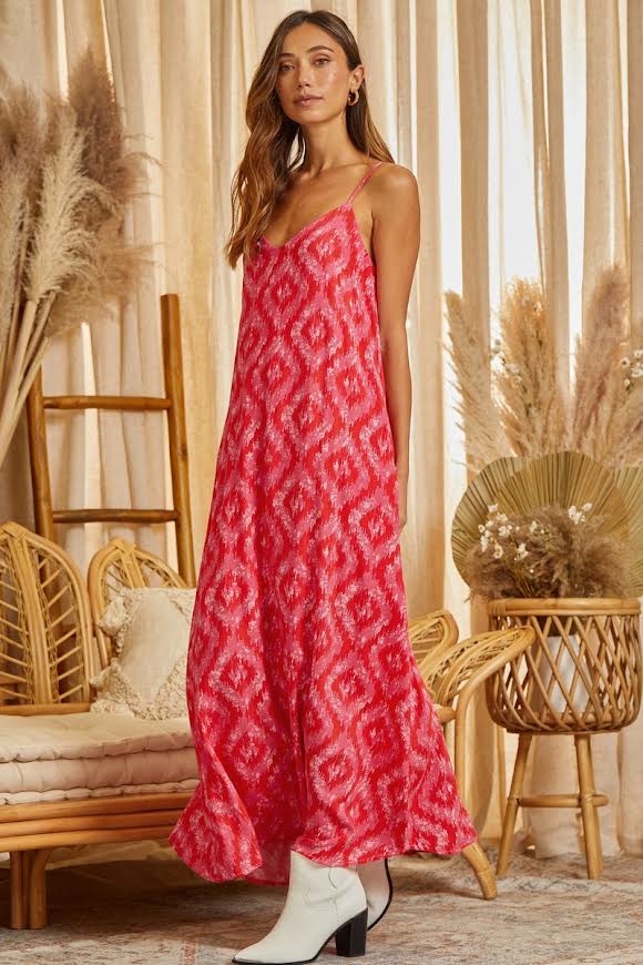 Who doesn't love a good maxi dress? This one you'll be reaching for season after season. Unleash the vibrant and confident you with our Printed Maxi Dress. Hot pink and light pink print accentuates the elegant V-neckline. Adjustable straps for the perfect fit. Embrace your feminine side and make a statement at any occasion.