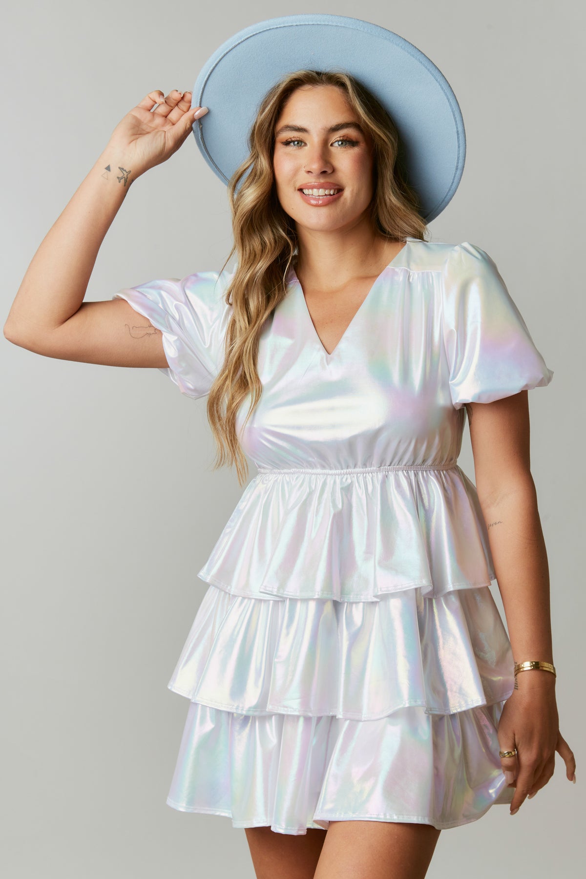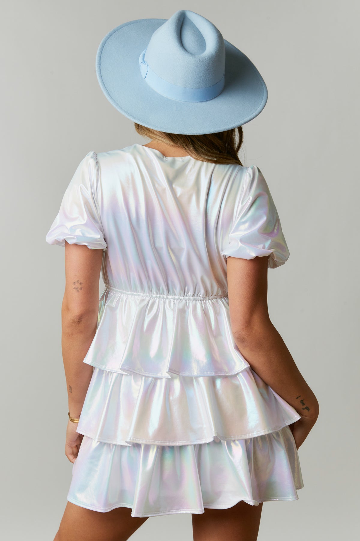 Hit the town looking flirtatious and fun in this show-stopping dress! Iridescent fabric, puff sleeves, and a tiered skirt are just a few of the features that'll make you stand out from the crowd. While the elastic waistband keeps you comfy - no need to sacrifice style for comfort!